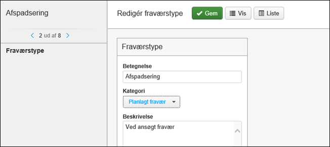 - Der vælges mellem fraværstyper af kategorien Planlagt fravær, f.eks. Ferie, Afspadsering, Fravær uden løn.
