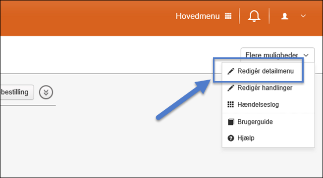 Hovedmenuen redigeres fra din personlige menu i øverste højre hjørne: Redigér hovedmenu.