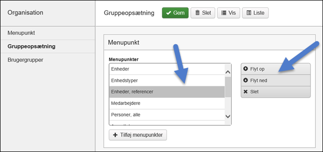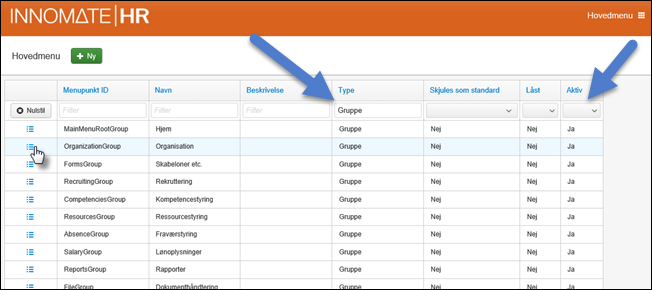 Listen over menupunkter filtrerer du efter type=Gruppe.