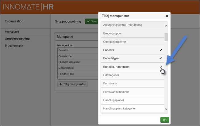 Der bliver vist en liste over samtlige menupunkter. Her klikker du de punkter ind, du ønsker skal indgå i gruppen.