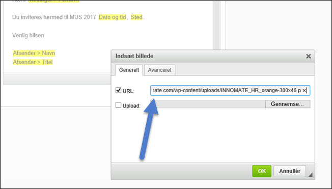 - Eller du kan markere 'URL' og angive et link til en billedfil, der ligger tilgængelig på en webside
