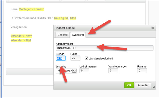 Når du har valgt billedfilen, går du til fanebladet 'Avanceret' og kan her angive en alternativ tekst, som vises i stedet for billedet, i de tilfælde, hvor modtagerens klient ikke understøtter visning af billeder.