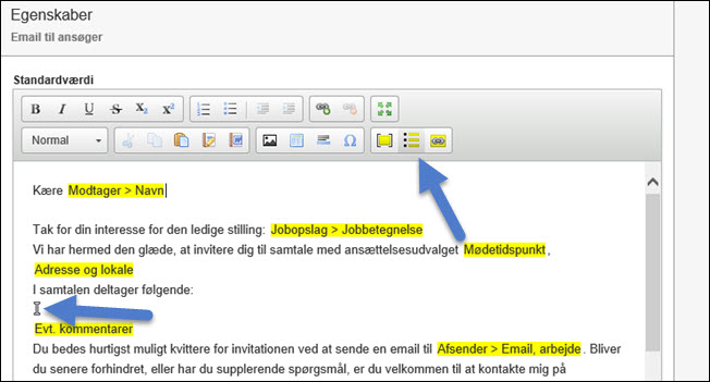 Her er et eksempel, hvor der i en HTML-skabelon til en email, der sendes som indbydelse til en ansættelsessamtale, er indsat en punkt-liste med navne og titler på medlemmerne af et rekrutteringsteam.