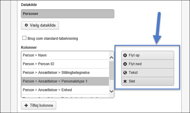 Efterhånden som vi tilføjer kolonner, kan vi fra oversigten vælge at flytte rundt på rækkefølgen eller helt slette. Kan kan også redigere teksten. Læs her om i Redigering af sprog i menuer og overskrifter.