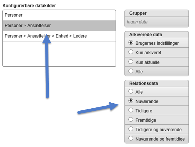 Næste linje i Konfigurerbare datakilder viser i vores tilfælde valgmuligheder for Ansættelser. Her er valg af relationsdata interessant. Vi vil ikke have vist historiske data og ej heller fremtidige data om medarbejderes ansættelsesforhold. Derfor vælger vi at markere i feltet Nuværende.