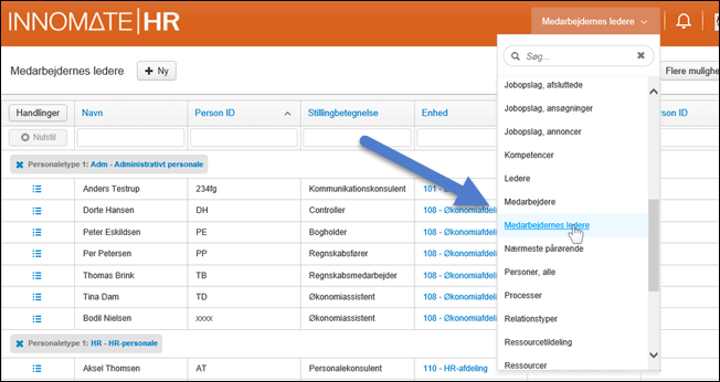 Øverst til højre kan vi vælger Grupper. Valgmulighederne er bestemt af de rettighedsregler, der er implementeret på det det aktuelle system. Her vælger vi Medarbejdere for at undgå at få vist personer, der ikke har en aktuelt ansættelse, f.eks. ansøgere til et job.