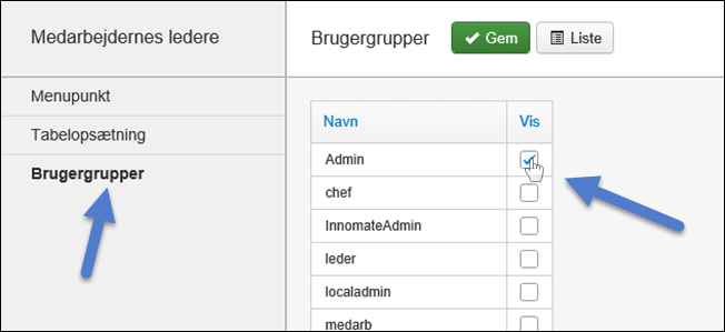 For hovedmenupunkter, skal der angives hvilke brugergruppe(r), der skal kunne se den pågældende liste i menuen og have adgang til den.