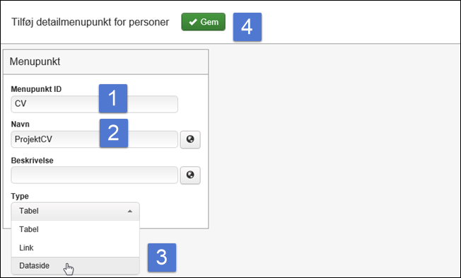 - Type (der kan vælges mellem Tabel, Link og Dataside). Vælg her Dataside.