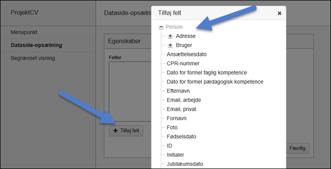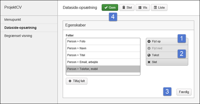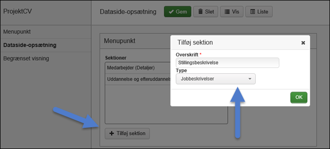 Herefter vises detailmenuen for opsætning af menupunktet ProjektCV.