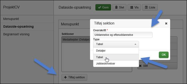Efter at have opsat indledningen med Detaljer, vælger vi nu en sektion af typen Tabel og kalder den Uddannelse og efteruddannelse.