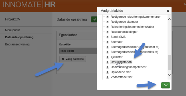 Her hedder datakilden Udviklingsforløb. Den markeres og der klikkes OK.