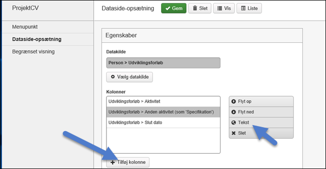 Som ved sektionstypen Detaljer, vælger jeg her de kolonner, jeg vil have vist. Jeg tilpasser rækkefølgen og overskriftsteksten (i stedet for 'Udviklingsforløb > Anden aktivitet', vælger jeg teksten 'Specifikation')