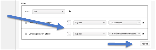 Da jeg vil bruge datasiden som CV til eksternt brug, ønsker jeg kun udviklingsforløb i gruppen 1. Uddannelse og kun forløb, der er registreret som Gennemført. Dette sætter jeg op i filteret. Læs mere herom i artiklen Opsæt filtre.