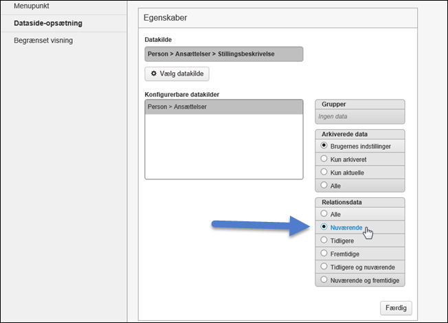 Uanset hvad vi anvender, er der i begge tilfælde tale om en relation, der er tidsstyret. Derfor vælger vi kun at få vist den stillingsbeskrivelse, der knytter sig til den nuværende relation.