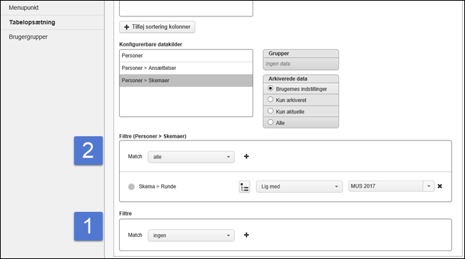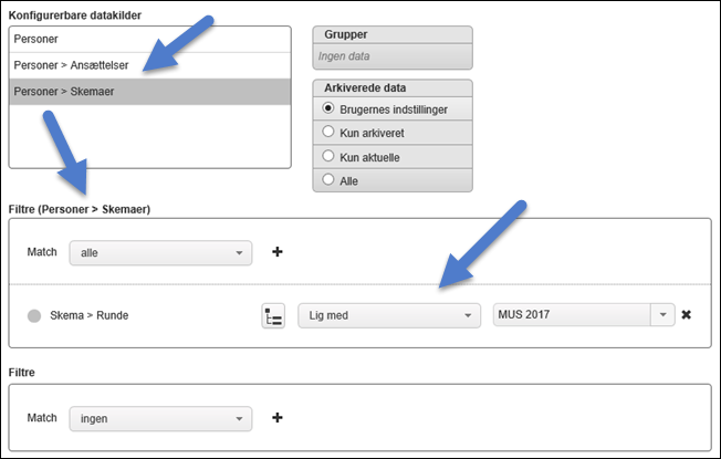 Vi har markeret den konfigurerbare datakilde Personer > Skemaer. Derved åbnes en mulighed for at filtrere denne under-datakilde. Vi har her valgt at skemaets runde skal være lig med MUS 2017.