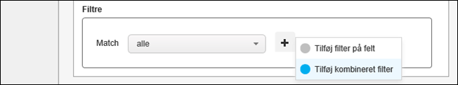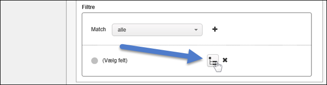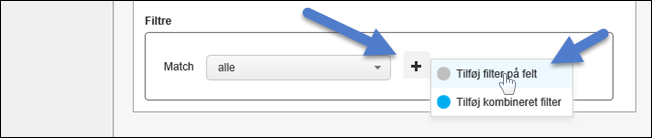 Vi lader 'Match: alle stå og klikker på + og vælger Tilføj filter på felt.