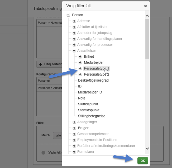 Her finder vi Ansættelser, folder ud og markerer Personaletype 1. Slut af med at klik OK!