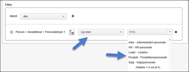 Efter valg af Personaletype 1, får vi mulighed for at vælge en personaletype og om resultatet skal være lige med eller forskellig fra.