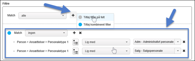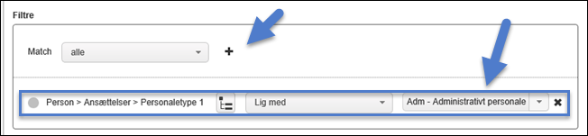 Vi har nu valgt kun at få vist administrativt personale og kan nu vælge at gemme resultatet. Men vi kan også tilføje et nyt filter ved at klikke på + og Tilføj filter på felt.