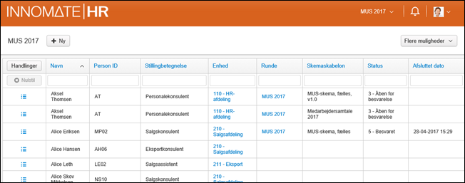 Resultatet af listen viser således alle medarbejdere og for hver medarbejder viser kolonnen Skema kun resultat for skemaer, der er tilknyttet runden MUS 2017.