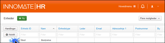 Ved klik på Enhed i detailmenuen og herefter på Liste øverst på siden vises den samlede liste over oprettede enheder.