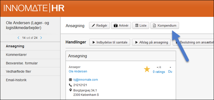 Fra ansøgningen til et jobopslag er det muligt at åbne en pdf-fil, der samler ansøgningen, alle de vedhæftede bilag, svar på evt. formular, ratings og kommentarer. Vi kalder filen for Kompendium.