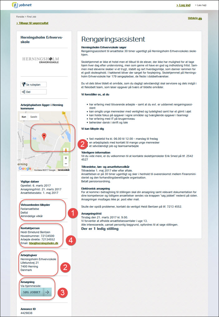 Sådan ser et jobopslag ud, efter det automatisk er blevet overført fra INNOMATE HR Rekruttering til Jobnet:
