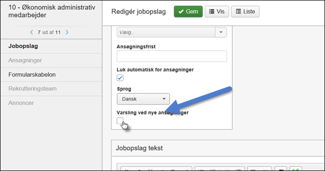 En ny tjekboks: Varsling ved nye ansøgninger, er placeret i jobopslagets statusfelt. Er feltet markeret vil medlemmer af rekrutteringsteamet modtage besked, når nye ansøgninger modtages.