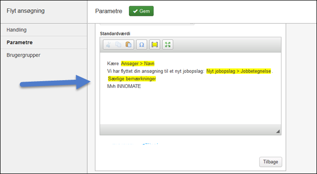 Vi har indbygget muligheden generelt i handlingerne Autosvar, Send besked til ansøger (f.eks. ved afslag), Indbyd til samtale og Flyt ansøgning.
